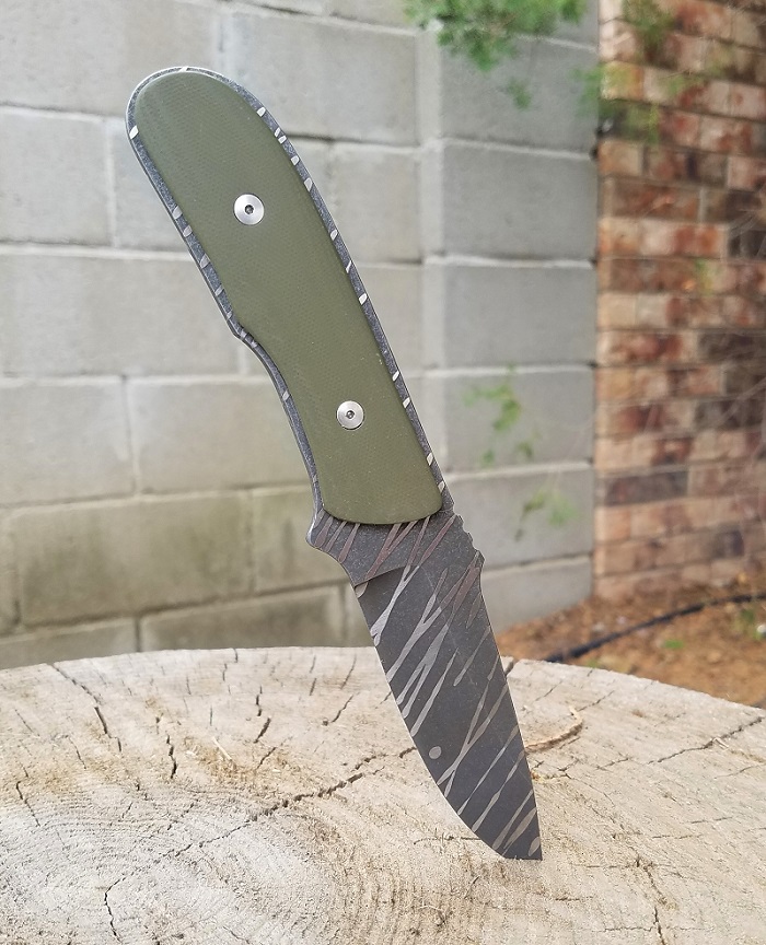 Scout ![]() Super light and easy to carry, the Scout is designed as an outdoor/survival knife that you will actually have with you when the trouble starts. Ground from 5/32" stock, witha 3 1/4" blade and is 8 1/4" overall. A stonewash finish, Kydex sheath, and either black G-10 "shadowboxed" scales or black paracord wrap are standard, though other colors of G-10 and paracord are available, as is a satin finish instead of stonewashed. Starts at $225 with scales, $175 with cord wrap. If you're of a more tactical bent, a false edge is an option, as shown on the one of the cord wrapped versions below. ![]() ![]() Cord wrapped version, shown as standard with stonewashed finish and black cord wrap. The handle shape is slightly different to accommodate the cord wrap. ![]() ![]() A cord wrapped Scout with optional false edge and satin finish. ![]() A Scout with green G-10 and optional "tiger stripe" stonewash finish. | Phantom | Imp | Worker 1 | Huron | Worker II 1 | Goblin | Goblin II 1 | Scout 1 | Seneca 1 | | Return Home | What's New | Fixed Blades 1 | Folders | Features and Options | Ordering and Contact Information | Available Knives | Frequently Asked Questions | Shop Tour | Other Stuff | Fixed Blades | |